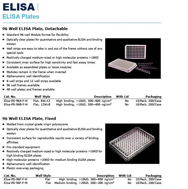 Home Up Call me back Contents Contact Immunology / Infectious agents / Cellular Biology / Molecular biology / Instruments / Lentiviral Technology / RNAi Libreries / Stem Cell Research / MicroRNA / Proteomics / Chemicals / Campaign / AntibodiesASSAY PLATES FOR HIGH THROUGHPUT SCREENING ASSAY PLATES - DEEP WELL TISSUE CULTURE PLATES CENTRIFUGE TUBES AND CRYOGENIC VIALS ELISA PLATES INOCULATING LOOPS AND NEEDLES ASSAY PLATES - FOR SPHEROTECH MAGNETIC SEPARATORS PCR PLATES PCR TUBE STRIPS AND CAPS SEROLOGICAL AND TRANSFER PIPETS SYRINGE DRIVEN FILTERS PREMIUM CELL CULTURE PLATES CRYSTALLIZATION MICROPLATES ELISA PLATES
